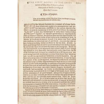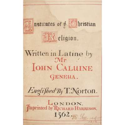 [The Institution of Christian Religion]. [London: Richard Harrison, 1562]. Second edition in English, folio in eights (26.8 x 17.5cm), 19th-century 'divinity' calf over bevelled boards, spine and covers decorated in gilt and blind, edges dyed red, signatures [superscript pi]A8 ²pi1 3T-3X8 A-2S1 2T4 2V-3R8 3S4, text in black letter, lacking title-page (pi1: replaced with early calligraphic manuscript title in red and black dated 1578, with later restoration to upper fore corner), preliminary quire [superscript pi] A damp-stained and with several repairs, ²pi1 silked, 3T-3X ('The Table') bound at front between ²pi1 and A1, damp-stained at foot with concomitant softening and fraying along bottom edges, occasional light damp-staining thereafter, becoming slightly stronger towards rear, old repairs to L4 and margin of 2U8, 3M-3S (i.e. terminal quires as bound) with small worm-track in lower margins, bookplate [ESTC S107157; STC 4416];