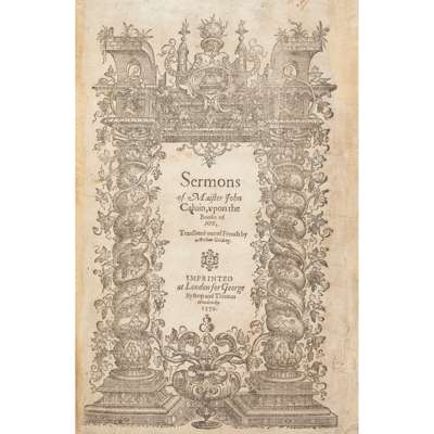 Note: The first edition in English of Calvin's Institutes appeared the previous year; for this second edition ESTC traces six copies only in UK libraries. The first edition in English of his Sermons, upon the Booke of Job was published in 1574, with another edition following in the same year. This third edition is especially rare, ESTC tracing four copies world-wide; there was a subsequent re-issue with a cancel title-page dated 1580 as in the colophon.