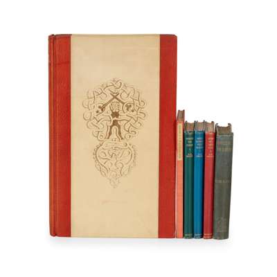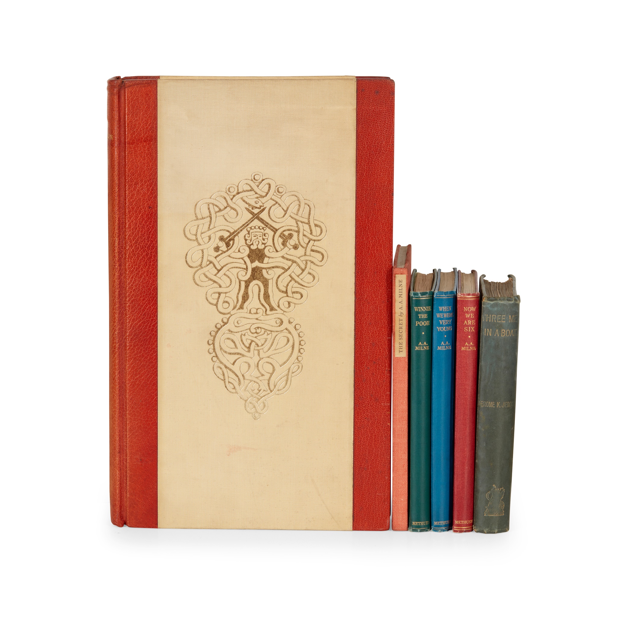 A New Translation from the White Book of Rhydderch and the Red Book of Hergest by Gwyn Jones and Thomas Jones, with illustrations by Dorothea Braby. London: Golden Cockerel Press, 1948. One of 550 copies, folio, original orange half morocco, cloth sides, top edge gilt, others untrimmed, wood-engraved frontispiece and title-page, full-page wood-engraved illustrations throughout, cloth sides slightly marked, small spot to limitation leaf. Together with 5 others: A. A. Milne, The Secret and Other Stories, New York: The Fountain Press, 1929, one of 742 copies signed by Milne on the half-title; ibid., When We Were Very Young, 1929, sixteenth edition, Winnie-the-Pooh, 1931, eleventh edition, Now We Are Six, 1927, second edition, all in original cloth; and Jerome K. Jerome, Three Men in a Boat, 1889, first edition