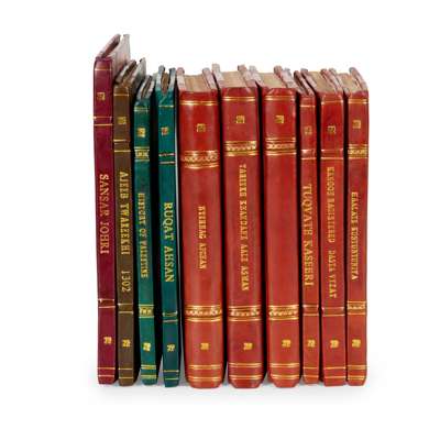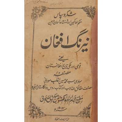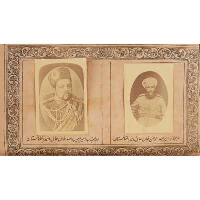 Mawlawi Sayyid Muhammad Husayn Aghlab Muhani. Nayrang-i Afghan ['The Charm of the Afghans']. Lucknow: Matba' Sham Oudh, 1904. First edition, 8vo (24 x 14cm), recent half leather, in Urdu, lithographed throughout, [2] 4 8 64 344 5 pp., 2 albumen-print photographic portraits of Abd al-Rahman Khan and Habibullah Khan mounted to leaf after title-page, variable browning, corner of pp. 23/4 detached, closed tear in pp. 225/6;