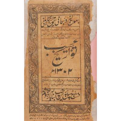 Note: Muhammad Jaffer Thanesari was a Wahhabi Muslim activist arrested in 1863 for conspiring to smuggle funds to anti-British mujahideen in Afghanistan. From 1866 to 1883 he was a prisoner at the Port Blair penal colony in the Andaman and Nicobar Islands. Tawarikh-i 'Ajib, an account of his time in prison, is also known under the title Kala Pani. Printed on the verso of the title-page is a testimonial in English from Richard Carnac Temple as cantonment magistrate, Ambala: 'I have known Muhammad Jafir to 10 years, first as a munshi at Port Blair and then as an employe [sic] here under me, whatever may have been his shortcoming in days gone by he seems to have profited by this severe punishment that overtook him and has been as long as I have known him a quiet, inoffensive man [...]'. A date in the colophon suggests that the work may have first been printed in 1887. The second work, Nayrang-i Afghan, appears to be a history of Afghanistan; the author's other works according to a note on the title-page include works on Russia (Kitab-i Rus) and the Islamic schools of law (Haqa'iq-i Madhahib).