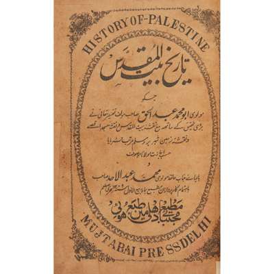 Mawlawi Abu Muhammad 'Abd al-Haqq. History of Palestine. [Urdu title:] Tarikh Bayt al-Muqaddas. Delhi: Mujtabai Press, 1891. 8vo (23.2 x 14cm), recent half leather, in Urdu, lithographed throughout, [2] 40 pp., 3 plates, marginal repair to title-page, small closed tear in final plate;