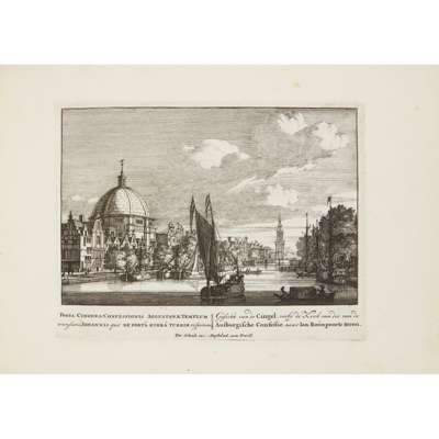 delectum, pictum, et aeri in cisum, per Johannem van Call. Amsterdam: Pieter Schenk, c.1700. Oblong 4to, 19th-century half calf, engraved throughout, with allegorical title-page, 64 plates (views of Amsterdam, The Hague, Het Loo palace, and the Rhineland), 4 calligraphic part-titles, dedication leaf, and mezzotint portrait of Frederick Duke of Saxony, lacking 7 plates (71 called for) and register leaf, part-titles, dedication leaf and portrait all bound out of order, title-page repaired verso, light foxing and a few other marks to margins, binding rubbed. Together with: