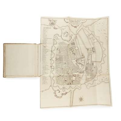 [Denmark] [Album of maps and views of Denmark mainly by Jonas Haas] 1760s. 4to (19 x 19cm), contemporary Dutch floral boards, contents comprise: 1) Generalem et prorius novam Siaelandiae tabulam geographicam, folding map of Zaeland, opening to 55 x 45cm; 2) Den Kongel. Residentz Stad Kiobenhafn ... 1764, folding plan of Copenhagen, approx. 55 x 40cm, a few small holes at folds; 3) Folding panorama of Copenhagen, 1764; 4) Folding plan of Frederiksberg; 5) Folding view of Frederiksberg slotsgaard; 6) Costume plate; 7-13) Further views of buildings and cities including Sophienberg palace, Fredensborg, etc.