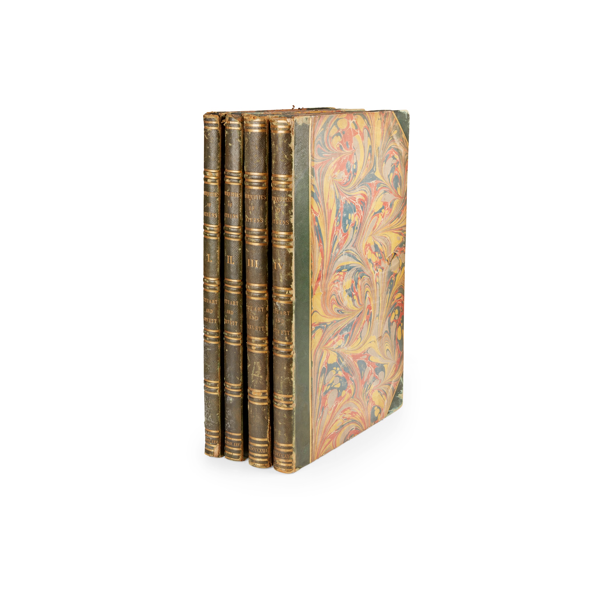 measured and delineated. London: Priestley and Weale, 1825-27. New edition, 4 volumes, folio, 191 engraved plates, errata leaf in volume 3, corrigenda slip in volume 4, contemporary green half morocco, spines gilt, blindstamp of the Glasgow Arts Club Library to title-pages, plates in volume 4 somewhat dampstained, plates in volumes 2 & 3 slightly dampstained in margins, some spotting, substantial spotting to volume 3, without the 2 engraved portraits of Stuart and Revett, rubbed, bookplates removed from endpapers