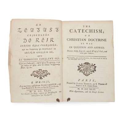 [Irish title: An teagasg Críosduidhe]. Paris: James Guerin, 1742. First edition, 8vo, contemporary tree sheep (lacking front board), liv 513 pp., parallel text and title-pages in Irish and English, small ink-stain to foot of title-pages, damp-staining to quires R, S and X [ESTC T97298];