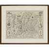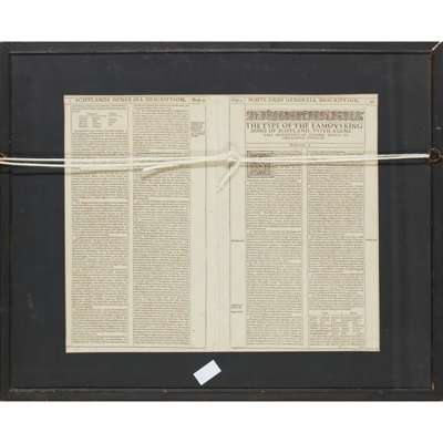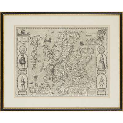London: John Sudbury and George Humbell, 1610 [i.e. 1611]. Engraved map, inset map of Orkney top right and 4 cartouches with full-length portraits of James VI and I, Anne of Denmark, Henry Prince of Wales, the future Charles I as the Duke of York, English text on verso, mounted, glazed both sides and framed, mount aperture 39.5 x 52.5cm, discreet old repairs to head and foot of central fold verso [Chubb 23]