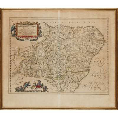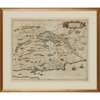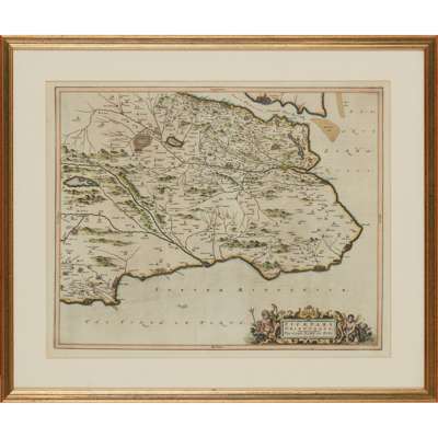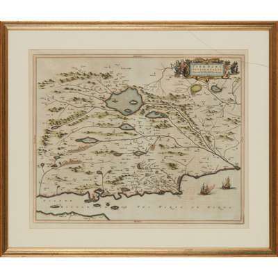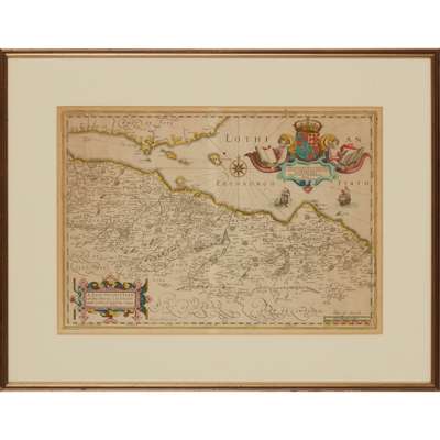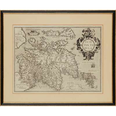 Together with: Abraham Ortelius, Scotiae tabula, Amsterdam, c.1600, engraved map, uncoloured, with large decorative strapwork cartouche, mounted, framed and glazed, mount aperture 37 x 49cm; and Hendrik Hondius, A New Description of the Shyres Lothian and Linlitquo, Amsterdam, c.1633, hand-coloured, mounted, framed and glazed, mount aperture 38 x 55cm