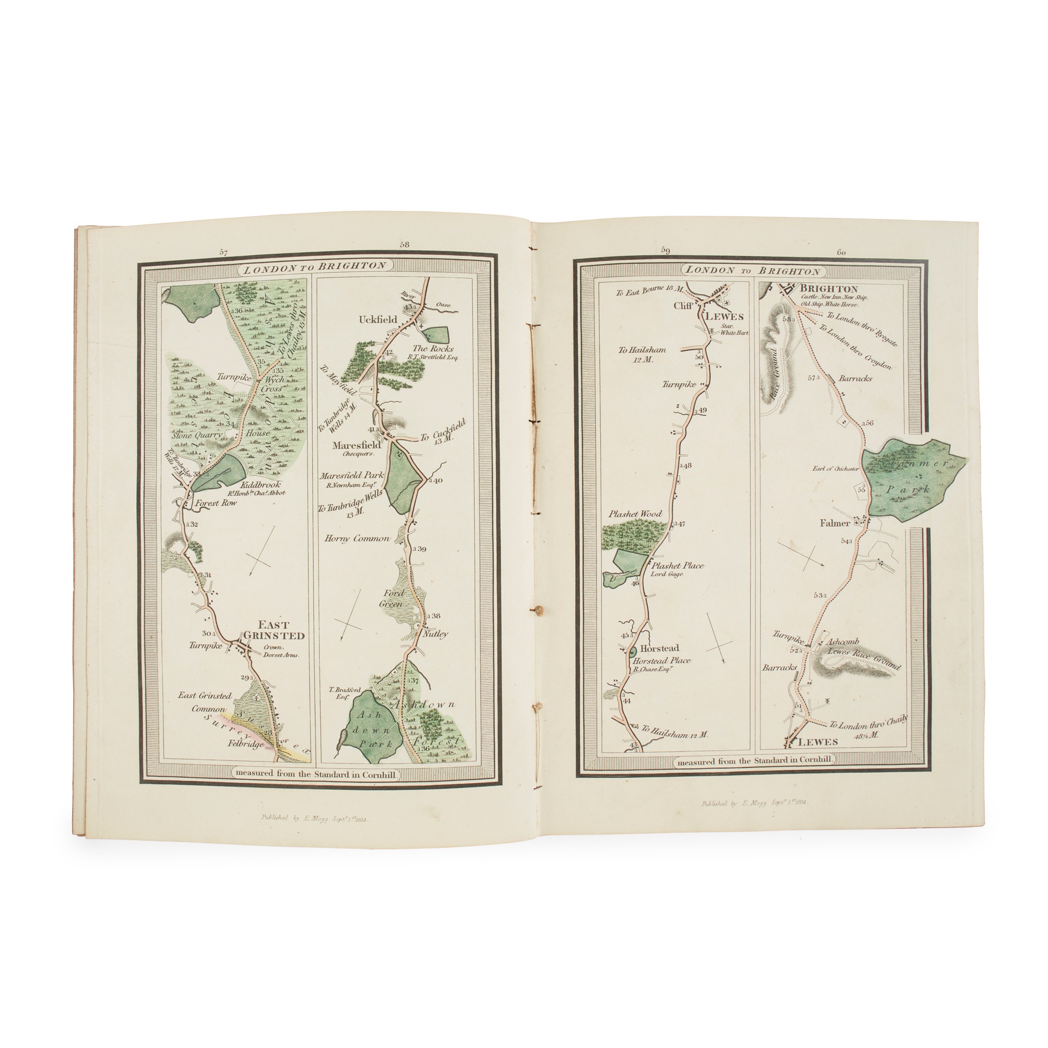London: E. Mogg, 1817. Volume 1 (all published), additional engraved title, 223 maps on 112 leaves, hand-coloured, with 30 additional strip maps, in red straight-grained morocco, covers detached