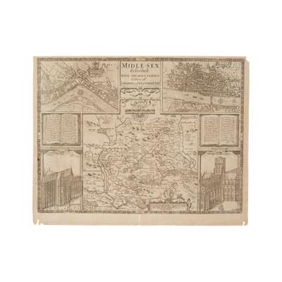 [London]: described by John Norden, augmented by J. Speed, sold by George Humble, 1611, uncoloured engraved map, plate mark 38.6 x 51.2cm, [sheet size 42 x 53.5cm], inset plans of Westminster, London and views of Saint Peters and Saint Pauls, English text on verso, very slight loss in lower margin at centre fold (repaired)