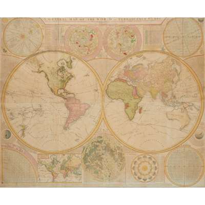 with all the new discoveries and marginal delineations, containing the most interesting particulars of the solar, starry and mundane system, by Saml. Dunn, mathematician. London, Published by Laurie & Whittle, No. 53, Fleet Street, 12th May, 1799. Large twin hemispherical hand-coloured engraved map, on 4 sheets conjoined, 103.3 x 124.3cm, with inset charts of the Solar System, Astronomical charts, an Astronomical Latitude and Longitude Annalema, a Chart of the World, Selenography or a map of the Moon, The Vicissitude of the Seasons Explained, and the Analemma, expertly laid onto thin conservation paper support