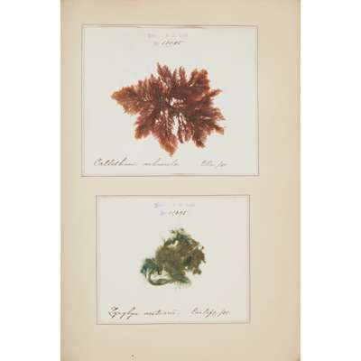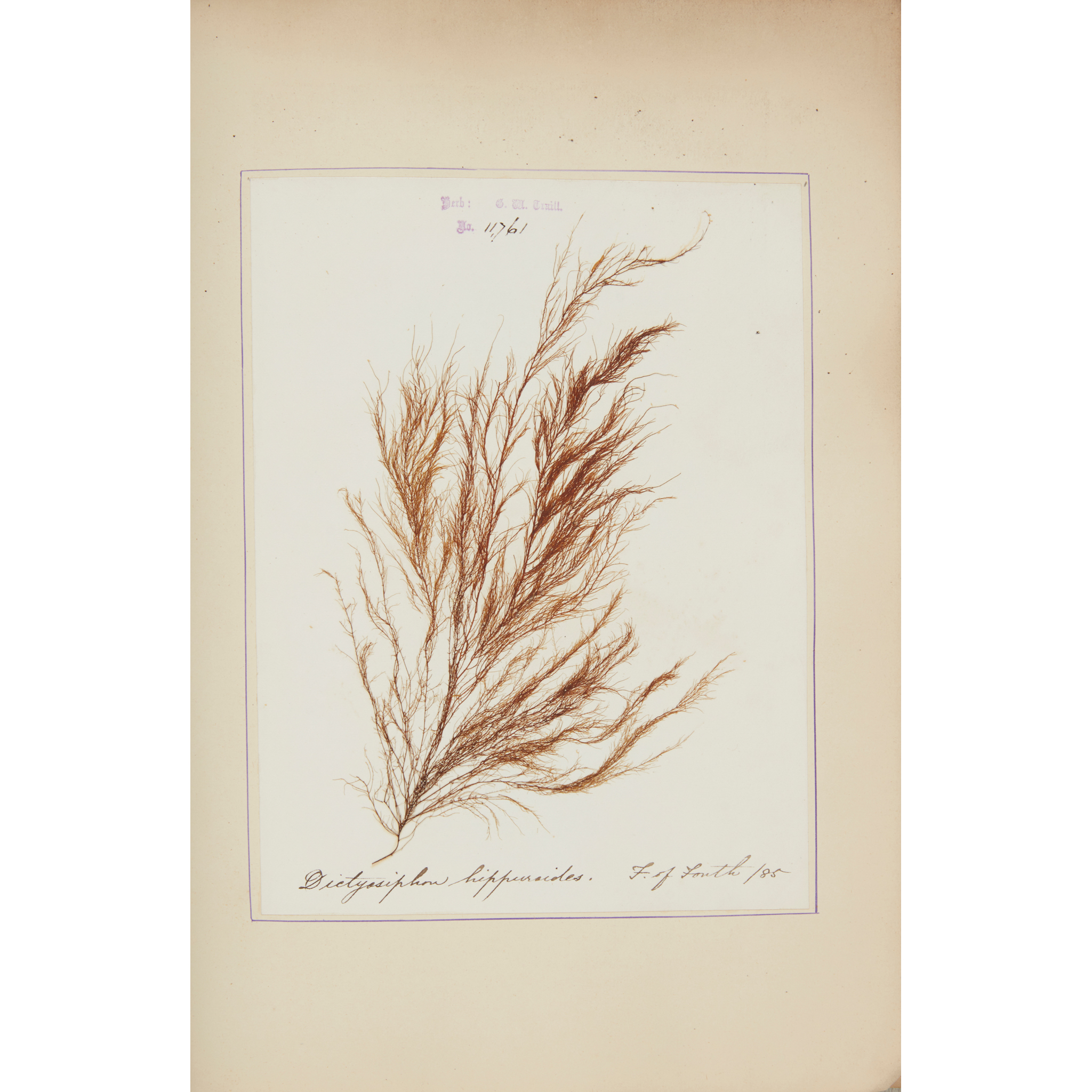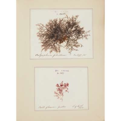 Illustrated with Herbarium Specimens of some of the Rare Species. Edinburgh: printed for the author by the Edinburgh Co-Operative Printing Company, Limited, 1885. 2 copies, both first and only editions, 4to (30.6 x 22.6cm), original cloth-backed printed boards, 16 [2] pp., each with mounted albumen-print photograph of the Lady's Tower, Elie and respectively containing 7 and 8 original algae specimens (on mounted slips, annotated), first copy inscribed 'Spencer C. Thomson Esq, with kind regards from the author' on front board (covers rubbed and darkened, shallow chipping to corners), second copy inscribed 'To the Royal Society of Edin[burgh] from the author', with ink-stamps of the Royal Society of Edinburgh to front board and title-page (front board with a few splash-marks to head and a little wear to corners)
