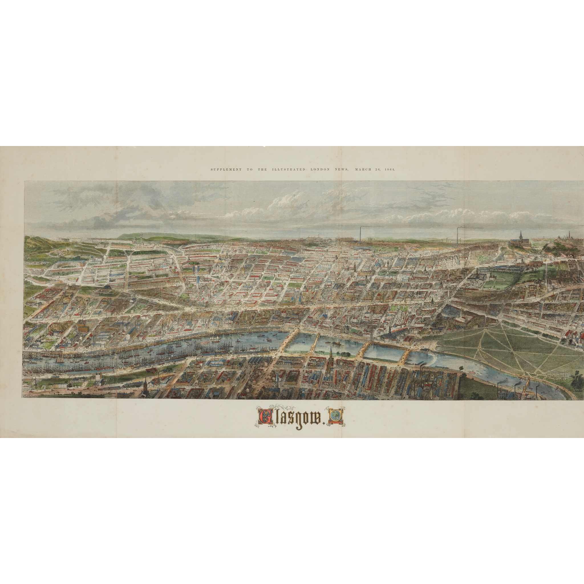 Hand-coloured panorama [Bird's Eye View of the City of Glasgow] by Thomas Sulman, 54 x 112cm, [from Supplement to the Illustrated London News, 26th March, 1864, small marginal strip top right corner (15.5 x 3.5cm) cut away and small closed tear just extending into image