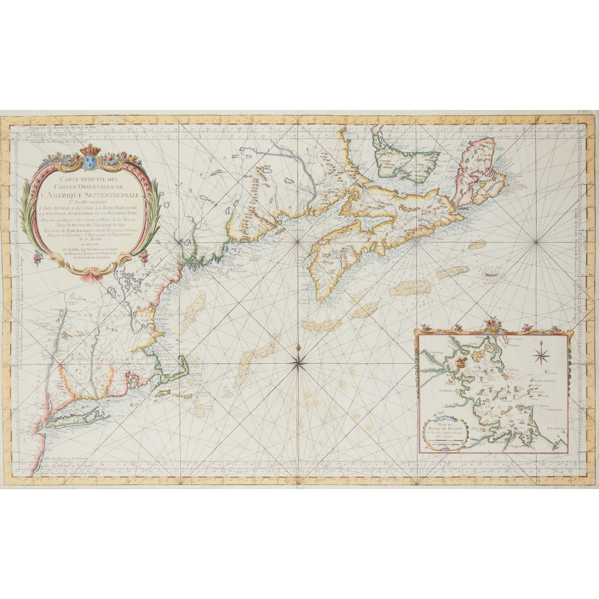 Iere Feuille contenant l'Isle Royale, l'Accadie, La Baye Françoise, La Nouvelle Anglettere et La Nouvelle Yorc, inset plan of Havre de Baston. [Paris: Depost des Plans de l'Academie de Marine, par ordre de M. de Machault, 1757] Engraved map hand-coloured in outline, 56 x 89cm, a few light marks or spots, professionally laid down on fine conservation paper