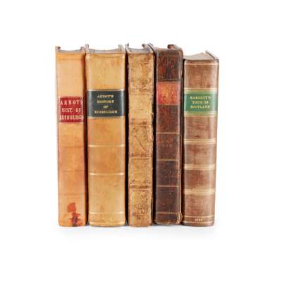 Arnot, Hugo. The History of Edinburgh, Edinburgh: W. Creech, 1779 & 1788. 2 copies, first and second editions, both 4to (26.5 x 19.5cm), contemporary calf, rebacked, first edition with engraved frontispiece, folding plan of Edinburgh (backed on linen), contemporary bookplate and ownership inscription (Tower of Alloa, seats of the earls of Mar), binding rubbed, contents toned, spotting to endpapers, frontispiece offset, second edition with advertisement leaf (not present in all copies), directions to the binder leaf, engraved folding plan (with short closed tear), 19 engraved plates (most folding, plate facing p. 565 repaired along top edge and with stain in image), lacking leaf 4N1 (Appendix XI, pp. 649/50, possibly cancelled), but with leaf 4N2 (Appendix XII, pp. 651/2) present in two states, the first with verso blank [ESTC T142880 & T143106];