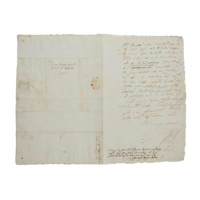 single bifolium (31 x 20.5cm), written on one side, 17 lines and signature ('R Essex'), ‘Mr Bagott, your sonne tellinge me of your good and kinde offer I was glad to take occasion at this time to use the same … I pray you therefore by this bearer send me 40 [pounds] …', annotated at foot, conjugate address panel addressed by Essex ‘To my lovinge frend Richard Bagott Esquier’ and with contemporary endorsement