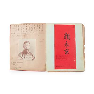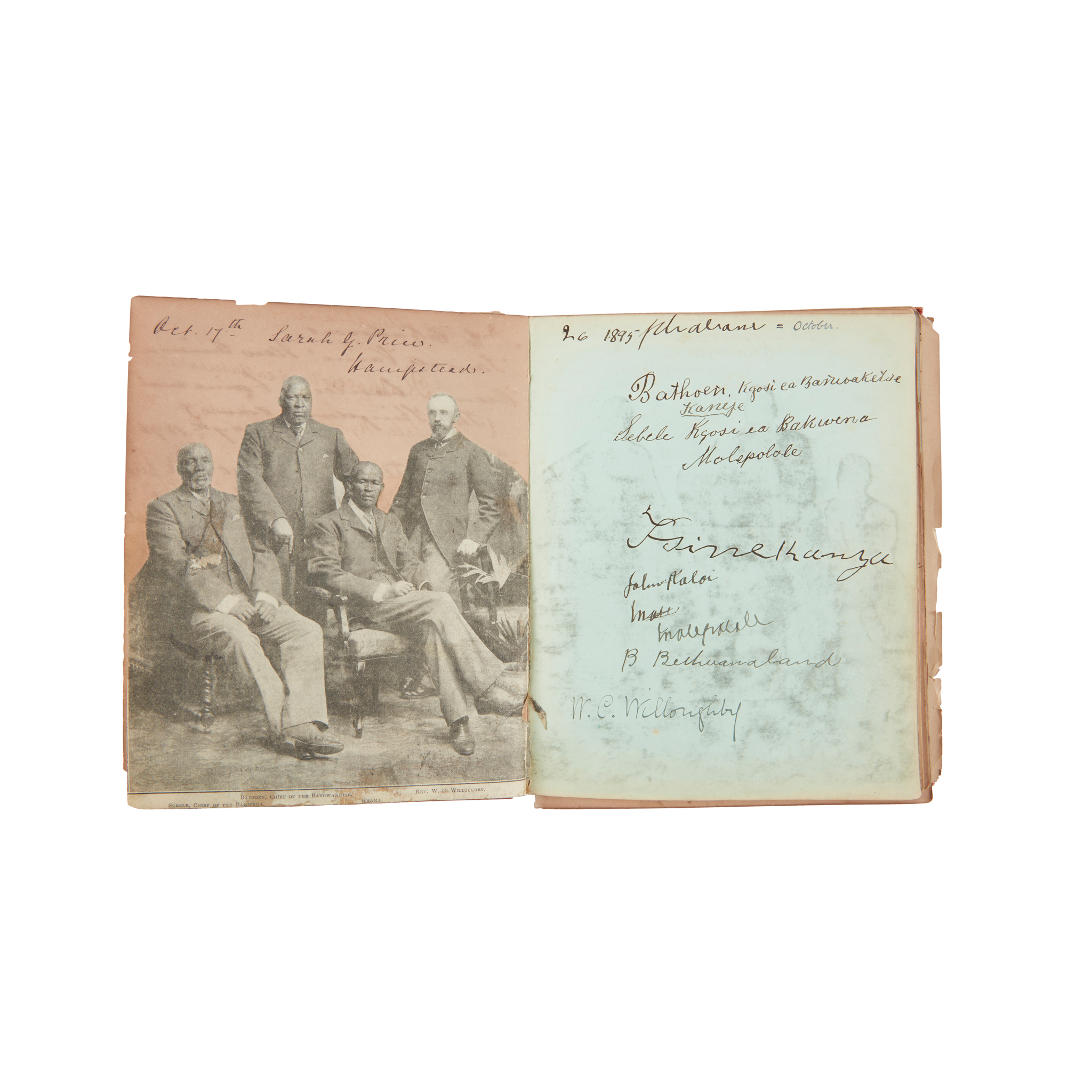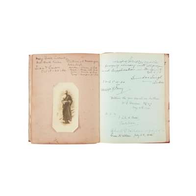 4to, red cloth binding, containing approx. 100 varicoloured leaves, filled with autograph entries mainly from missionaries (British and native) on the occasion of visits to Sheffield, including their name, date of visit, place of service, and a message, often in both English and the relevant native language, the book containing several thousand entries in total, including: Yung-King Yen (1838-1898), American Episcopal missionary in Shanghai (1894), his message comprising a translation of Thessalonians into Chinese and his signature in Chinese and English, with a pasted-in portrait photograph and his Chinese visiting card on red paper); James Chalmers (1841-1901), Tamate, New Guinea (1895), eventual cannibalism victim, his message including John 3:16 in English and a native language; Bathoen I (c.1845-1910), Sebele I (d.1911) and Khama III (c.1837-1923), respectively chiefs of the Bangwaketse, Kwena and Bangwata peoples of Bechuanaland (Botswana), on the occasion of their 1895 tour of England to gain support against the proposed annexation of their lands by Cecil Rhodes and the British South Africa Company; Sadhu Sundar Singh (1889-c.1929), Sikh-born Christian missionary, his message comprising Ephesians 6:18 in English and Urdu, dated, 1920, with full-page photographic portrait mounted to facing page; William Booth (1829-1903), general of the Salvation Army (1893); and numerous others, including Arthur Bonsey (1858-1942), Hankow, Amy Easter Brockway, Ambositra, Madagascar, 1897 (her message including John 14:1 in Malagasy), John Knox, Vizagapatam, 1897, including John 4:2 in Telugu, Samuel Lavington Hart, principal of the Anglo-Chinese College, Tientsin, 1900, Ebenezer and Blanche Cooper, Samoa, 1901, James Duthie (1833-1908), Travancore, 1902, Ruth Massey, Wuchang, 1902, in Chinese and English, Lillie E. V. Saville, Peking, 1904, in Chinese and English, James and Annie Sharman, Antananarivo, 1906, and similar, including missionaries operative in numerous locations across Africa, India, Burma, China and elsewhere. A few leaves torn in gutter, 2 leaves (1910 and 1922) loose