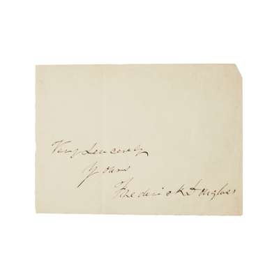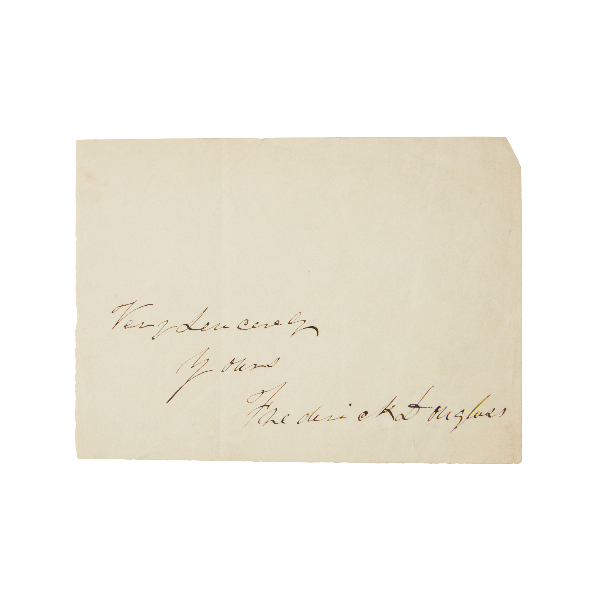 'Very sincerely yours, Frederick Douglass', in black ink on slip of wove paper (9.8 x 13.5cm)