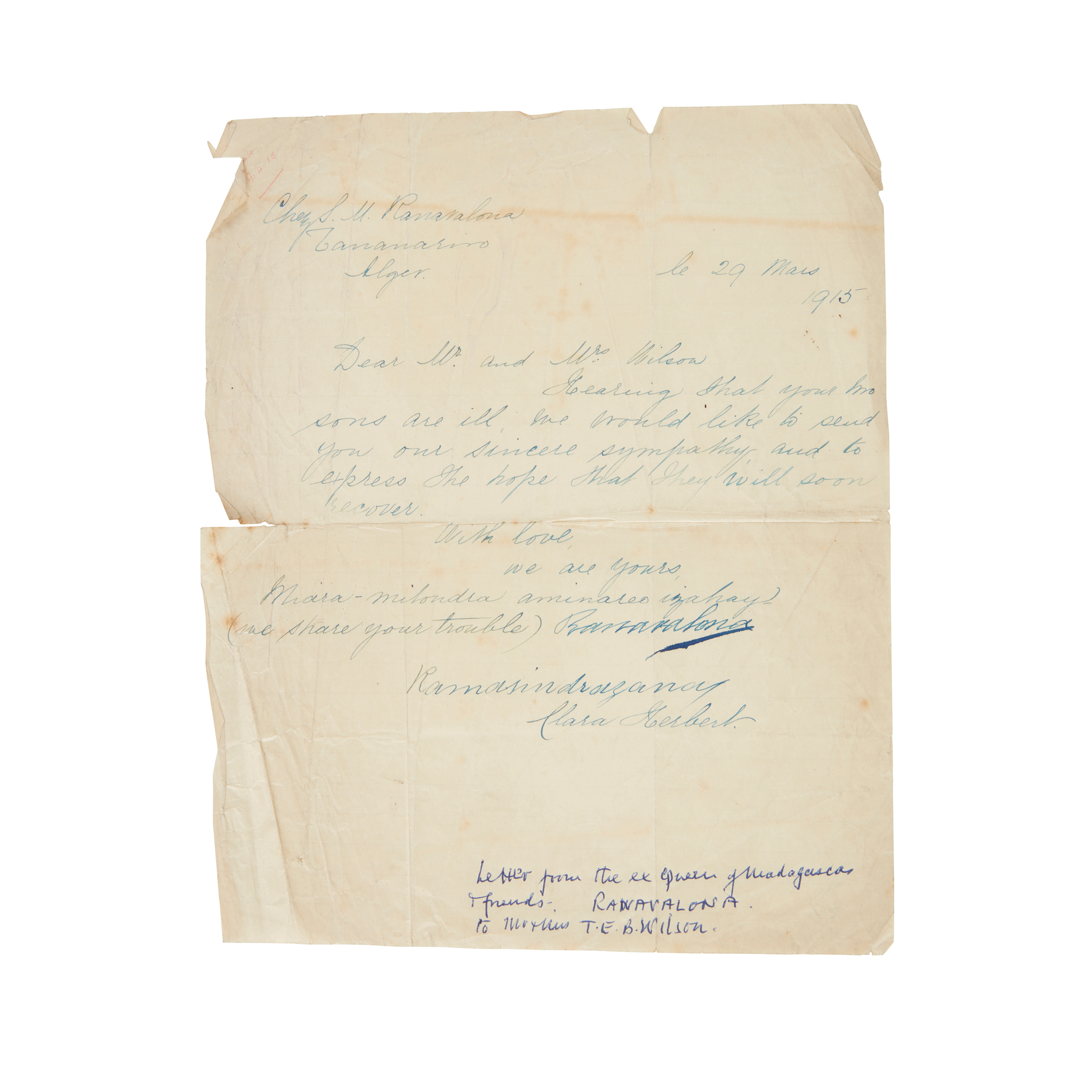in blue ink on one side of single sheet, 25 x 20cm, reading 'Dear Mr and Mrs Wilson, Hearing that your two sons are ill, we would like to send you our sincere sympathy and to express the hope that they will son recover', apparently written by Ranavalona's paid companion Clara Herbert (her signature at foot, together with the name of Ranavalona's aunt Princess Ramasindrazana, also in Herbert's hand), with Ranavalona's autograph signature (using the same pen), creased and toned, chips and splits to extremities, a few spots, with annotation at foot in blue ink by David R. Wilson (see note) identifying the recipients as 'Mr & Mrs T[albot] E[edward] B[aines] Wilson' (of Eastbank House, Sheffield)
