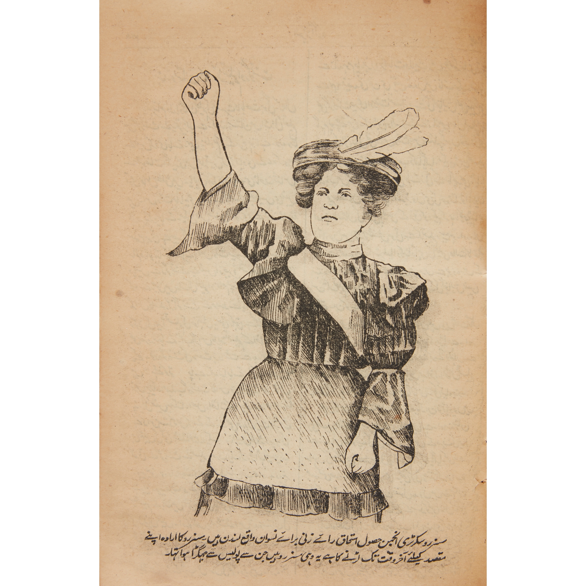 [Periodical]. Al-'Aziz. Agra: Munshi Abdul 'Aziz, 1907. Approx. 14 numbers in 1 volume, each issue with decorative title-page (with title imposed on a globe in early cases), lithographic illustrations throughout, contents including: dedicated number on women ('Zinana number'), including articles on Zeb-un-Nissa Begum, women's fashion, etc., portraits of Queen Alexandra, women from different nations (Parsi, Russian, French, etc.); dedicated number on Afghanistan, with portraits of Habibullah Khan, Inayatullah Khan, etc.; other numbers including portraits of Lala Lajpat Rai, a possible suffragette (British woman in white sash with fist raised), binding shaken;