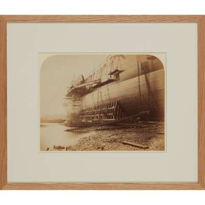 Robert Howlett’s iconic images of the construction of the Great Eastern are remembered as ‘some of the most significant photographs of the 19th century’ (Hannavy, Encyclopaedia of Nineteenth-Century Photography, 2008, vol. 1, pp. 717-18). The Great Eastern was by far the largest ship ever built at the time, and remained so when she was scrapped in 1888. Though an unprecedented marvel of engineering, the project was a financial disaster. Brunel died a few days after her departure on its maiden voyage in 1859. Howlett himself had died the previous year, his colleagues believing that his untimely death had been brought about by the chemicals used in his photographic work; his Great Eastern series is today regarded as ‘epitomizing the spirit of Victorian engineering and endeavour’ (ODNB).