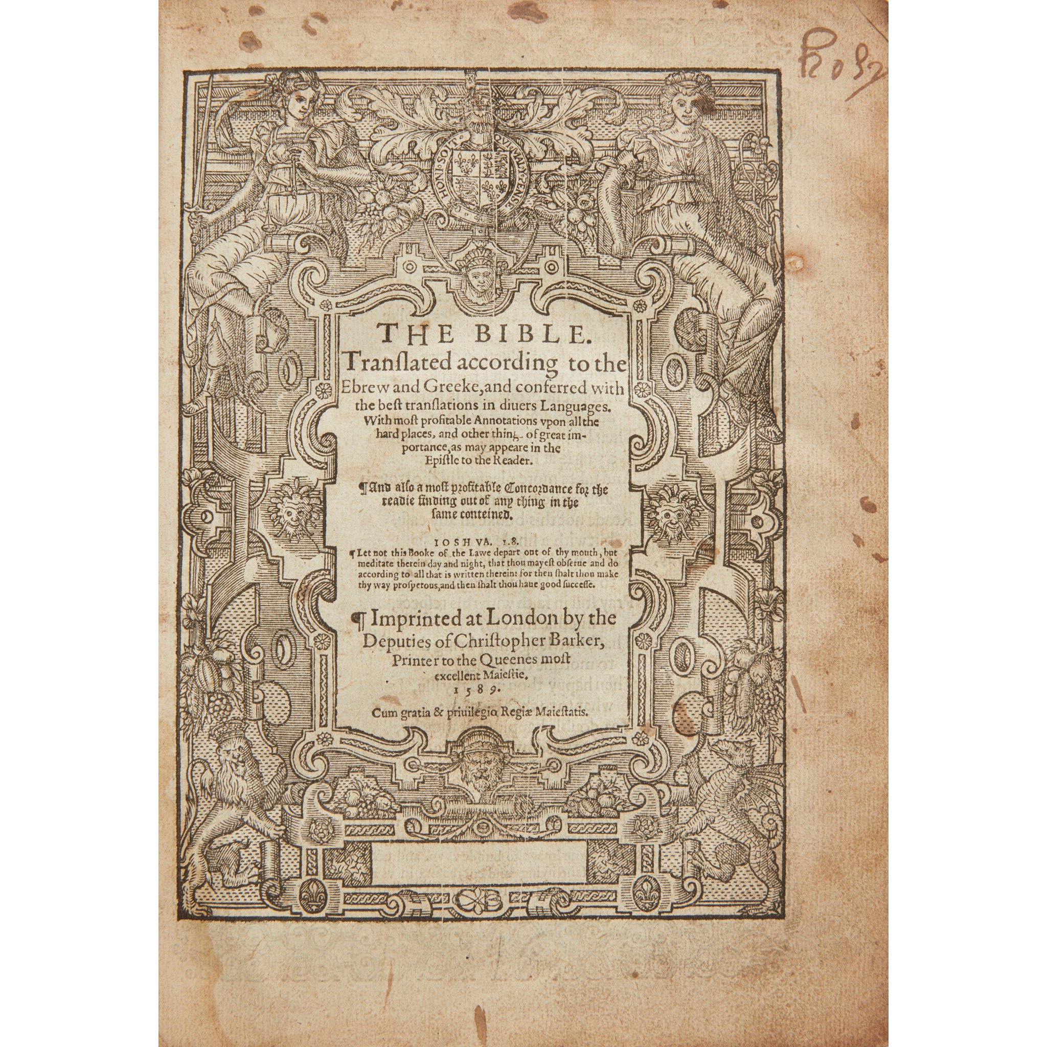 and conferred with the Best Translations in Divers Languages. London: deputies of Christopher Barker, 1589. 4to (21.2 x 14.7cm), sigs. pi2 A-3H8 3I2 *4 (lacking *1, New Testament title-page) 3K-3Y8 3Z10, [2] 432 443-444 [3] 441-554 ff., text in black letter, general title-page with strapwork woodcut border, toning, D6-E1 with closed tear at foot of gutter, 2Q-2R small worm-track in gutter, 2X3-6 repaired closed tear, repairs to quire *, burn-hole in 3L6, bound with Book of Common Prayer at front (incomplete), Concordances (complete) and Psalms (incomplete, damp-stained, one leaf repaired) at rear, c.1800 tan calf (covers detached, label, pocket and slip of Lancashire County Library to front pastedown and free endpaper), toning [Darlow & Moule (rev. Herbert) 199]