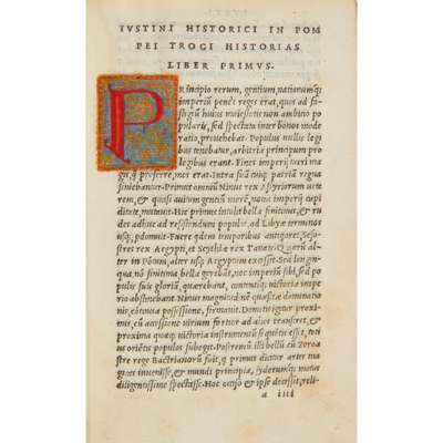 Venice: in aebidus Aldi et Andreae Asulani soceri, 1522. 8vo (14.9 x 8.5cm), 204 ff., c.1900 full vellum, gilt spine, edges sprinkled red, woodcut Aldine device to title-page and verso of final leaf, numerous hand-painted initials in red around printed guide letters, one on decorative foliate ground in blue and yellow, printed in italic types, moderate spotting, short closed tear in o7 [Adams J723; Ahmanson-Murphy 209; Renouard 96.9]