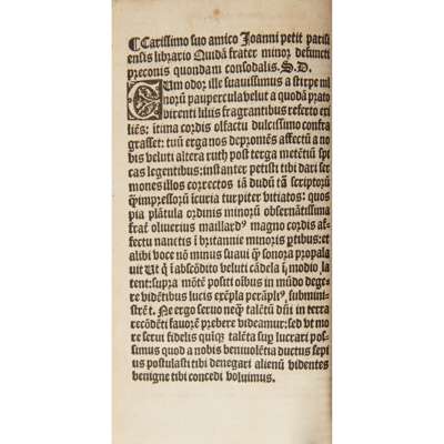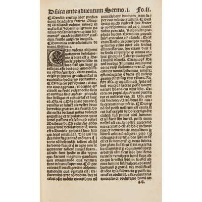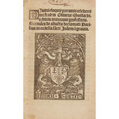 [Bound with:] Sequuntur quattuor sermones comunes per adventum et consequenter Dominicales sermones nondum impressi. Paris: Jehan Petit, 22 December 1511 [second work undated]. 2 works in 1 volume, 8vo (15.2 x 9cm), 116 [5] and 102 ff., 19th-century French tan calf gilt by Ottman-Duplanil, all edges gilt, each work printer's large criblé woodcut device to title-page, criblé woodcut initials, printed with rounded Gothic types in double columns, first work title-page with small stain to foot of title-page and 19th-century ownership inscription to head, short closed tear to top edge of leaf k2, second with silverfish damage to lower margin of E3 not affecting text [neither in Adams; cf. USTC 180642 for another edition of Sermones de adventum, dated 1511 but with different foliation; USTC cites one edition of Sequuntur quattuor sermones dated 1518]