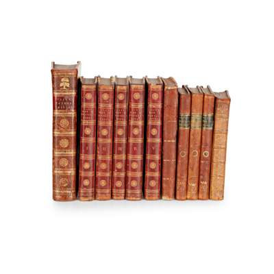 including her Correspondence, Poems and Essays. London: Richard Phillips, 1803. First edition, 5 volumes, 8vo, contemporary red half morocco, smooth spines gilt in compartments, marbled sides, engraved frontispiece, 10 plates of manuscript facsimile (several folding), contemporary book-labels of Anne Isabella Kevill to front pastedowns, spotting to front and rear of each volume;