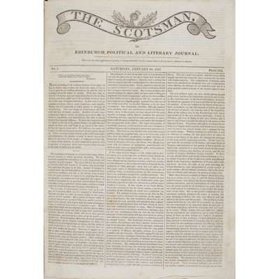 From 25th January to 27th December. 1817. Edinburgh: printed for the Proprietors, by Aberneth and Walker. Folio, comprising issues no.1-49, contemporary half calf, tear to p.81 (first page of no.11) with some loss to text, a few other closed tears, a little spotting and browning, child's scribbles in blue biro to flyleaf