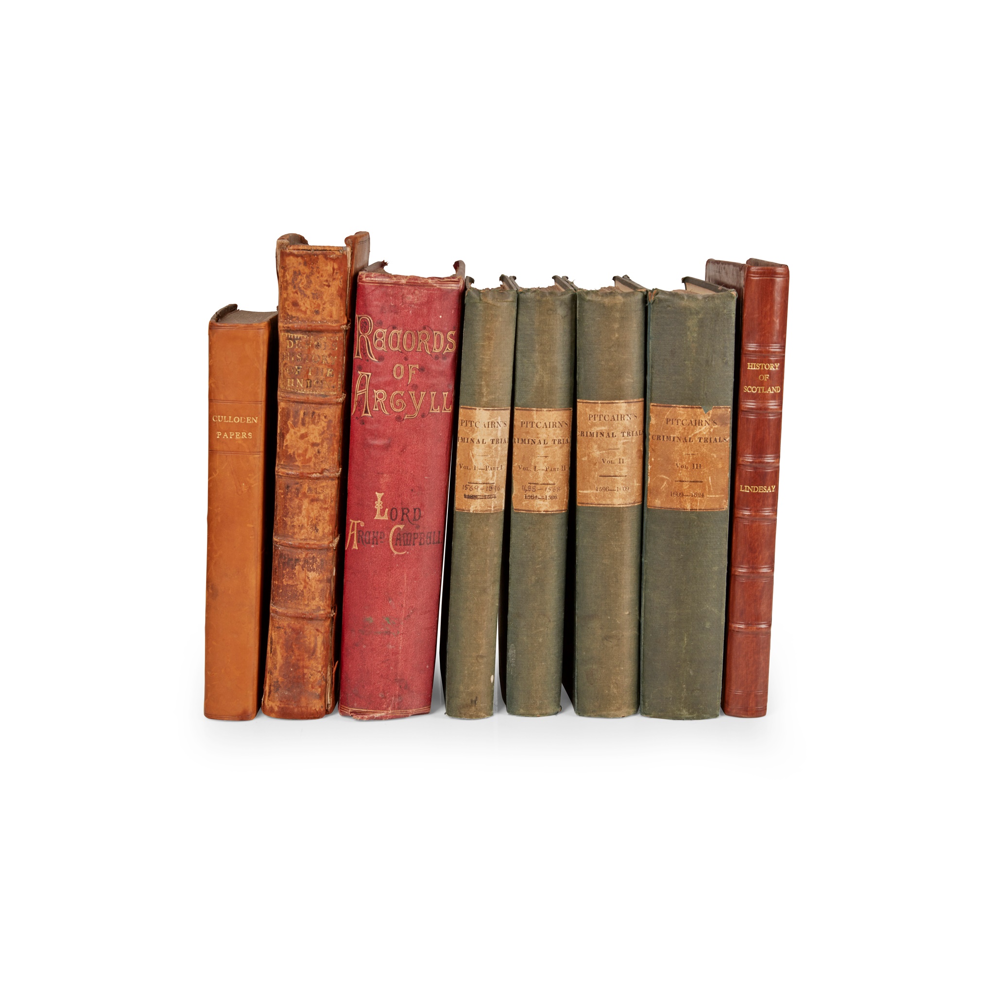 Pitcairn, Robert. Criminal Trials in Scotland from [1488] to [1624], embracing the entire reigns of James IV and V, Mary Queen of Scots, and James VI. Edinburgh: W. Tait, 1833. 4to, 3 volumes in 4 (volume 1 being in 2 parts), engraved plates, including facsimiles, original cloth, one hinge broken;
