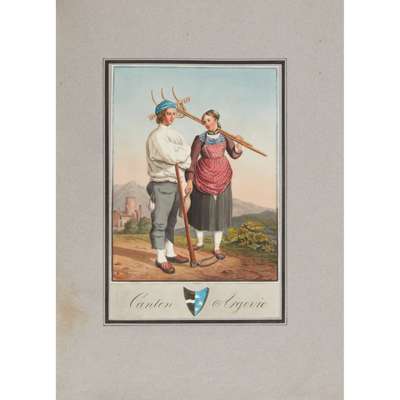 Basel & Bern: J.P. Lamy, c.1820. Folio, 19 only (of 32) hand-coloured Swiss costume studies, each mounted, blue morocco gilt with red gilt onlaid title to upper cover, without title of text, one mount torn