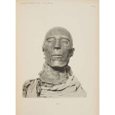 Cairo Museum. [Group of works from the Catalogue général des antiquités égyptiennes du Musée du Caire]. Cairo: Imprimerie de L'Institut Francais D'Archéologie Orientale [except first title, Berlin: Reichsdruckerei], 1902-1939. 7 works, folio, contemporary half morocco (Maspero & Gauthier's work in quarter morocco, top edges gilt, marbled endpapers, numerous black and white plates from photographs, Manchester Libraries labels and stamps, titles comprise: