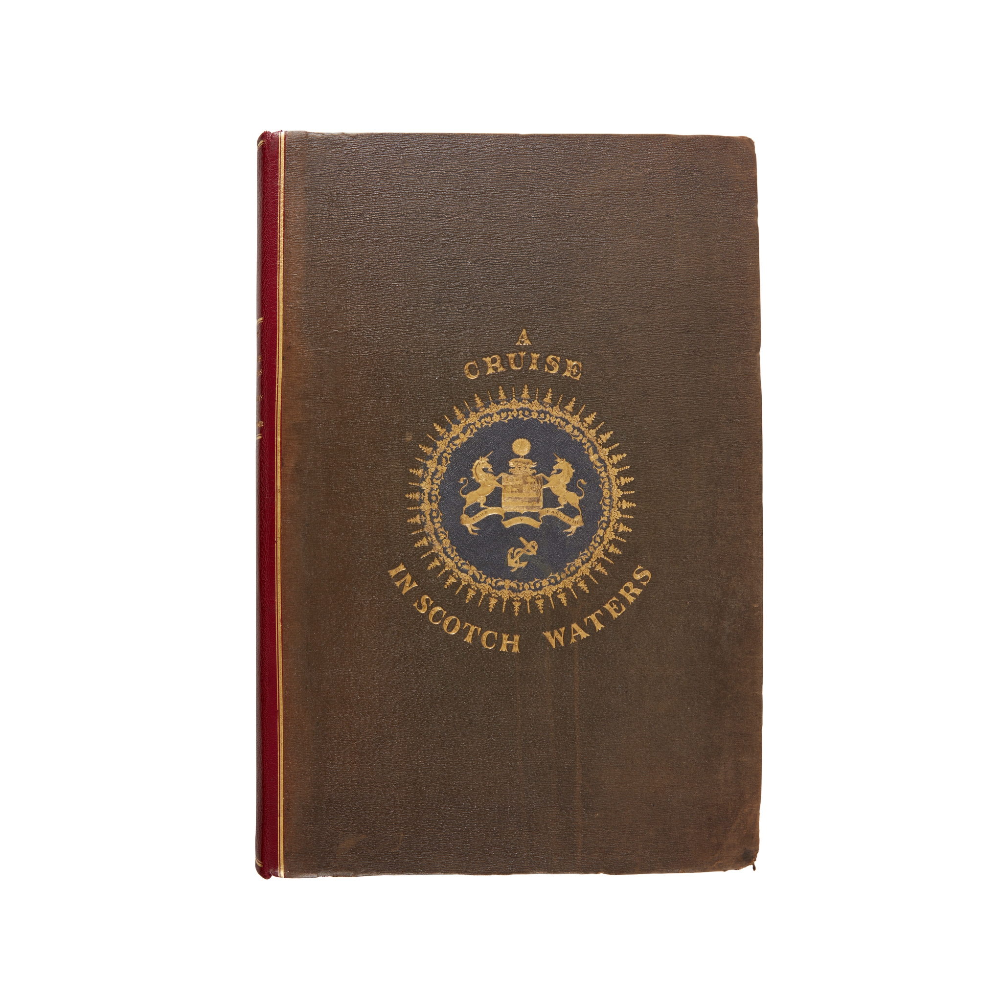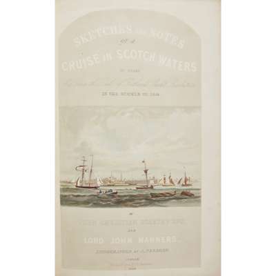 on Board His Grace's the Duke of Rutland's Yacht Resolution, in the Summer of 1848. London: Thomas McLean, 1850. Folio (49.6 x 33cm), original cloth, rebacked in red morocco, gilt decoration to front board, 74 pp., tinted lithographic title-page and 28 similar plates (4 folding) by J. Needham after Schetky, all hand-coloured and heightened in gum arabic, lithographic dedication leaf, original spine mounted to rear free endpaper, dedication leaf slightly spotted, offsetting from plates to text, 'Armadale Castle' with marginal finger-mark, 'Earl Patrick Stewarts old castle of Scalloway Zetland' slightly spotted at foot, folding plates 'On the River Clyde' and 'Tobermory' with a little marginal spotting, 'Kyles of Bute' loose, 'On the River Clyde' and 'In Glen Nevis' each with old creasing to one corner, a few other marks [Abbey Scenery 494]