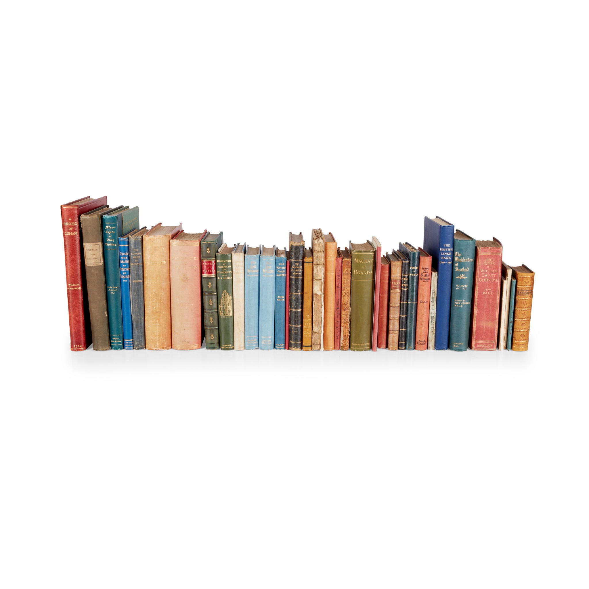 and 25 others, including Natural History of Arbroath and District by Thomas F. Dewar, 1893 (first edition, original cloth, inscribed), The Sough o' the Shuttle; or Poems and Songs by Colin Sievwright, Weaver, Kirriemuir, Dundee, 1866 (first edition, original wrappers, front wrapper near detached), Bannatyne Club, Liber S. Thome de Aberbrothoc, Edinburgh, 1848 (4to, original cloth), An Original Collection of the Poems of Ossian, Orrann, Ulin, and other Bards ... collected and edited by Hugh and John M'Callum, Montrose: printed at the Review Newspaper Office, 1816 (8vo, original boards, rear board detached, front board near detached), and similar (including broader Scottish interest)