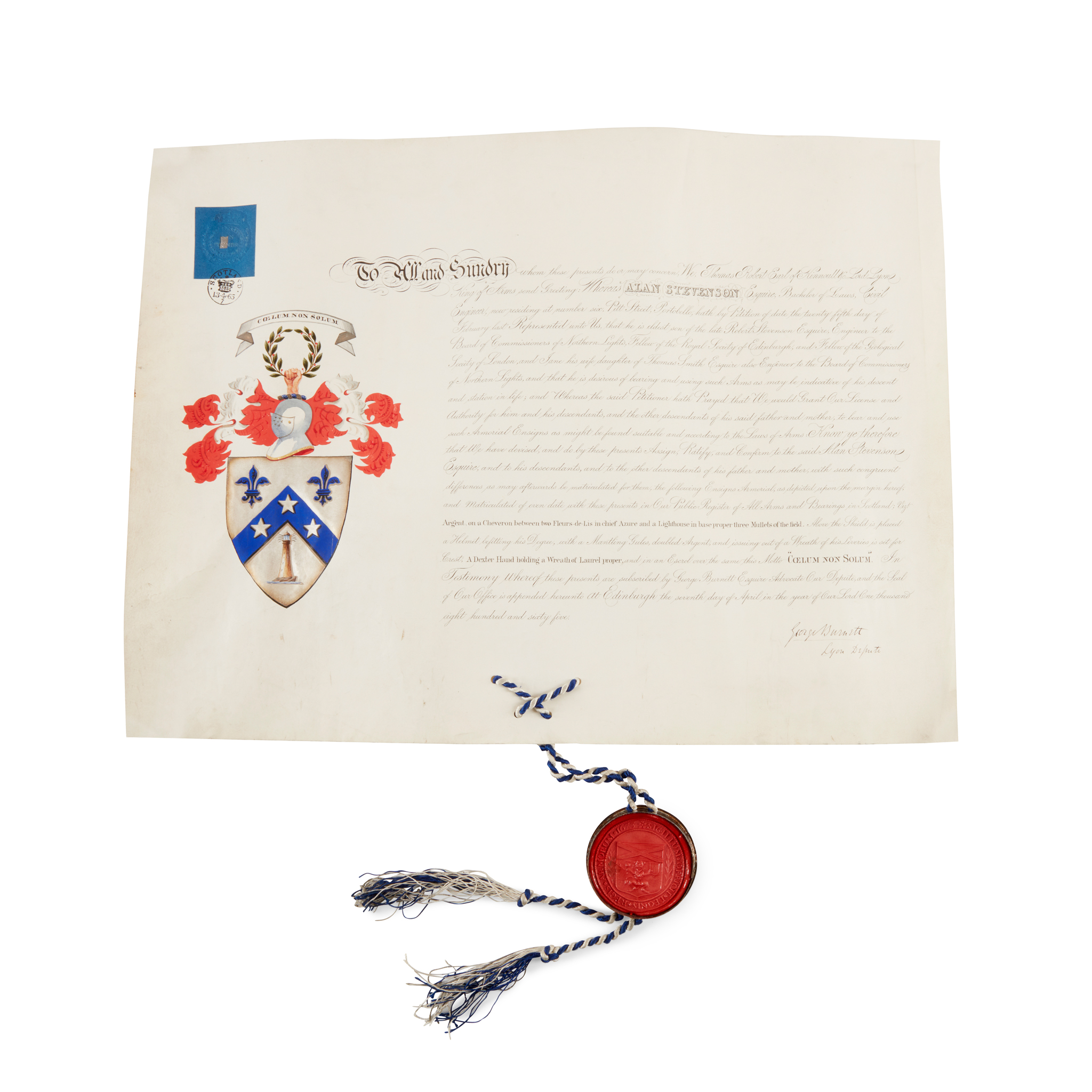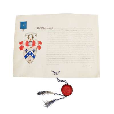 Grant of Arms given to Alan Stevenson, with seal and hand-drawn and coloured arms;