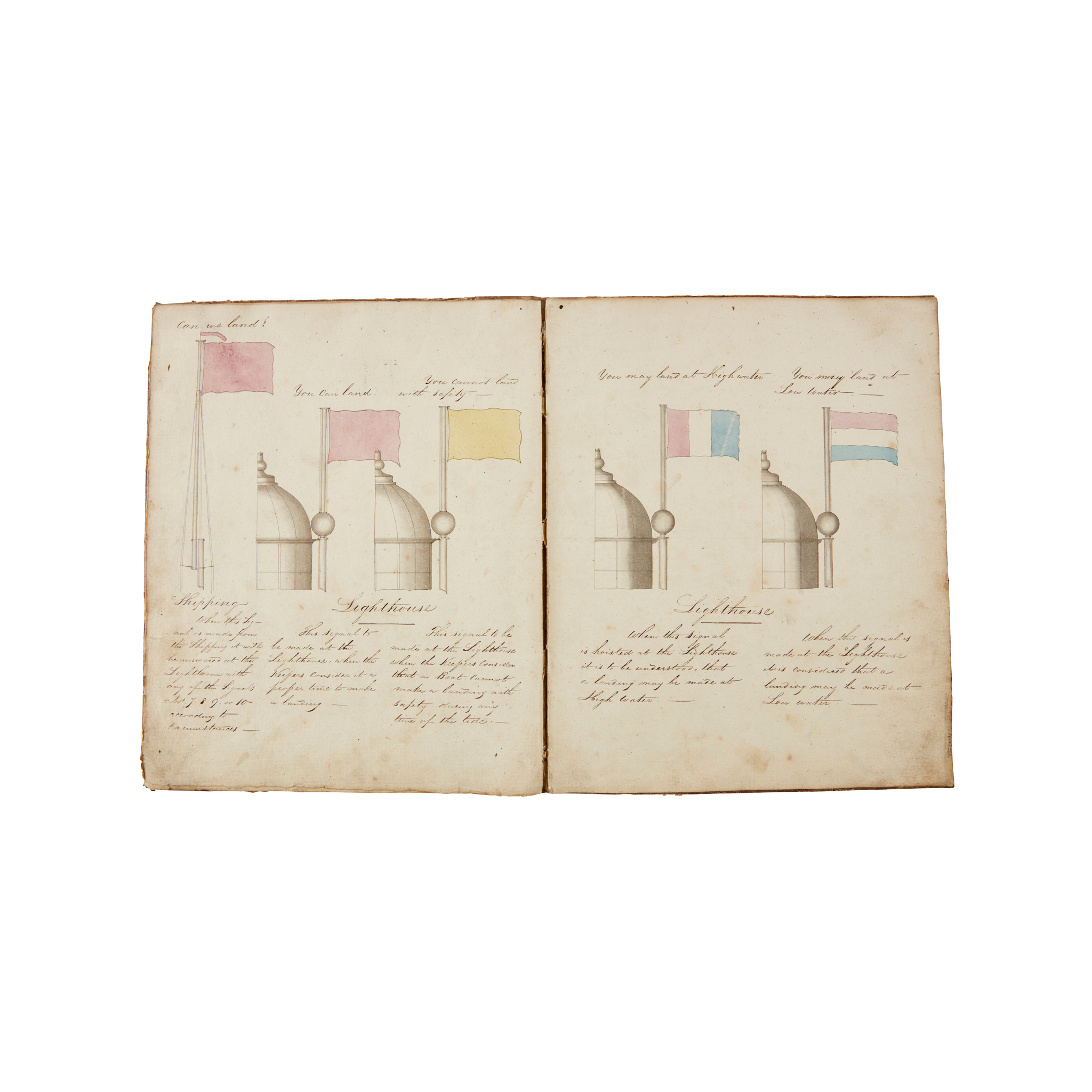 The Bell Rock Lighthouse was built between 1807 and 1810 by Robert Stevenson, and is the world's oldest surviving sea washed lighthouse. The Arbroath Signal Tower was built in 1813 to communicate with the lighthouse, and continued to do so until it was decommissioned in 1955. It is now a museum telling the story of the lighthouse. The main method of signalling between the lighthouse and the tower were large copper balls, which would be raised in the morning to indicate all was well. The initial illustration in the manuscript depicts the lighthouse's signal ball, with the caption: "When all is well at the Lighthouse in moderate weather, the Ball to be hoisted to the top of the Flagstaff every morning at Nine and continues up 'till Ten Oclock..." The manuscript continues, as an instruction manual, to describe each position of the ball, its meaning and which flags should be raised on various occasions or depending upon who is in residence.