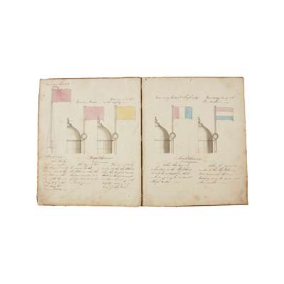 bound manuscript, 32 x 26cm, comprising 11 pages with 28 hand-drawn and coloured illustrations showing positions of the copper signal ball and various signal flags with descriptions, early 19th century, contemporary half vellum over boards, paper label reading 'Regent Sender' to upper cover, some soiling to leaves, covers rubbed and worn