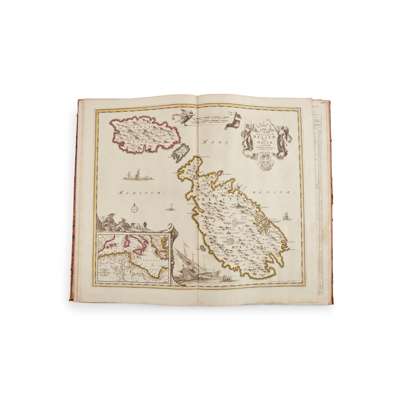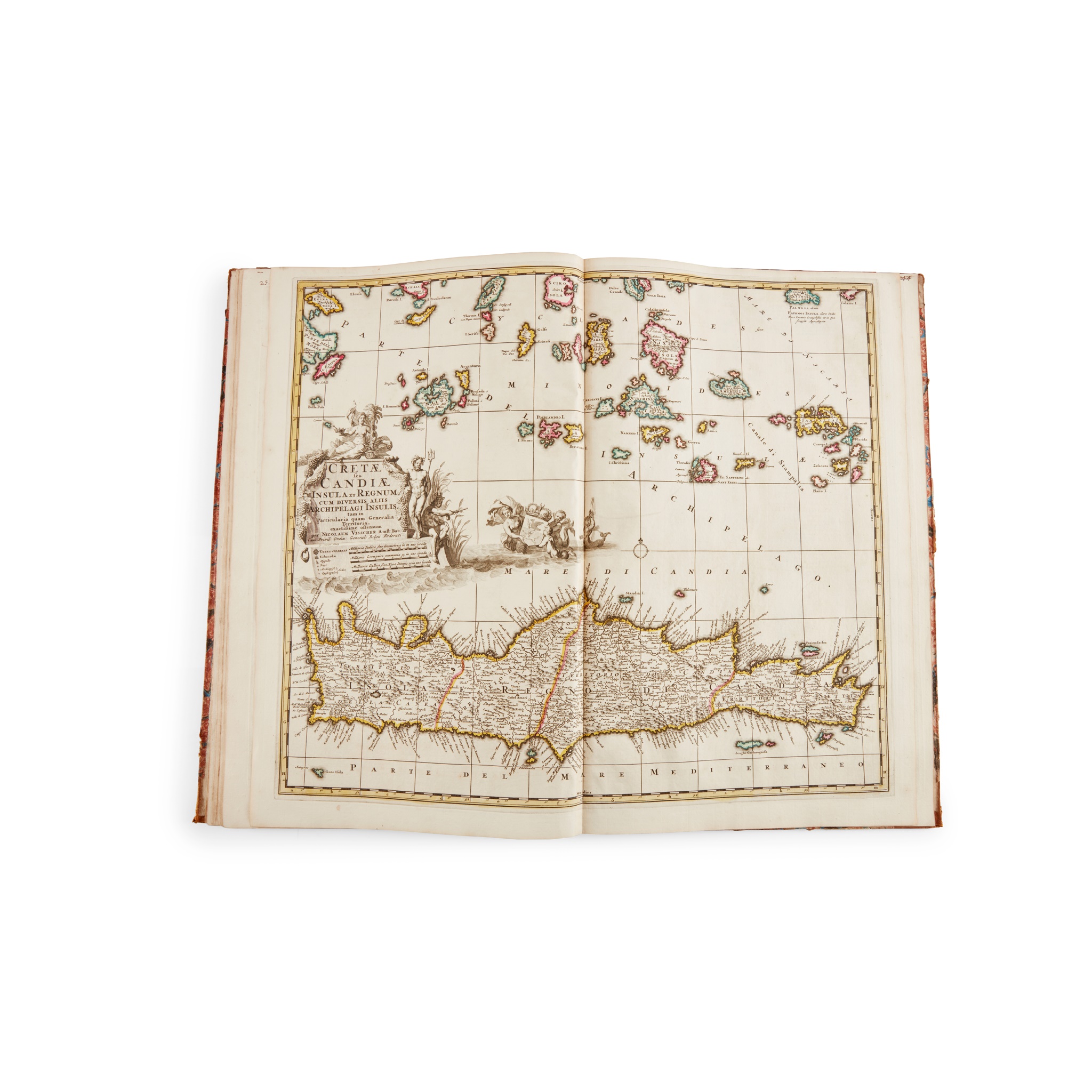 Amsterdam: Nicolaes Visscher, c.1700. Large folio, contemporary half calf, marbled sides, 27 engraved maps (all by Nicolaes Visscher except 11 and 12, by Joannes Blaeu), each a single broadsheet folded once and mounted on guard, opening to 52.5 x 61cm (except maps 2, 3, 14 and 21, on larger sheets and consequently with extra folds), contemporary hand-colouring throughout, contemporary manuscript titles on versos, most maps with allegorical title cartouches, many also with decorative dedications and mileage charts, maps 16, 20 and 22 embellished with naval scenes, 6, 17, 24 and 26 with printed gazetteers on versos, contemporary manuscript list of contents to front. Contents comprise: