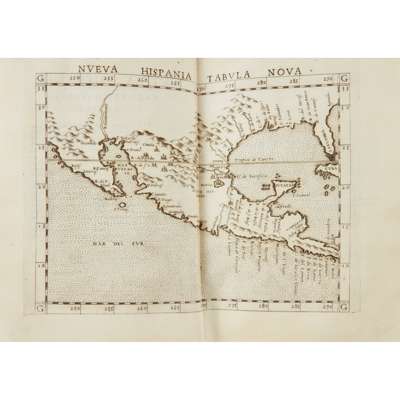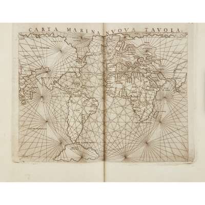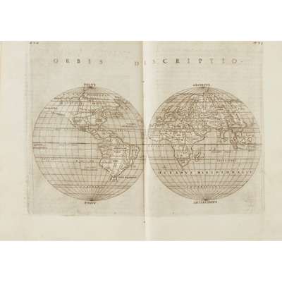 A complete copy of the first edition of Ruscelli's translation of Ptolemy in contemporary vellum. Ptolemy's 'Geography' was rediscovered at the beginning of the fifteenth century and translated into Latin from the Greek, although none of Ptolemy's maps survived. Cartographers such as Giacomo Gastaldi recreated the maps from the descriptions, and the results can be seen here.