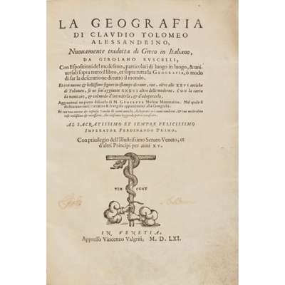 Nuovamente tradotta di Greco in Italiano, da Girolamo Ruscelli ... Venice: Vincenzo Valgrifi, 1561. 4to (24 x 18cm), 64 maps, contemporary vellum with manuscript title to spine and initials to upper cover, 20th century ownership signature (Alan Stevenson) to paste-down endpaper, early ownership signature to title-page, some very light and minor marginal dampstaining, browning and occasional soiling in places, page numbers added in an early hand to unpaginated sections, maps neatly mounted on slightly later guards, a few binding anomolies not affecting the flow of the work, covers a little frayed [USTC 851489]