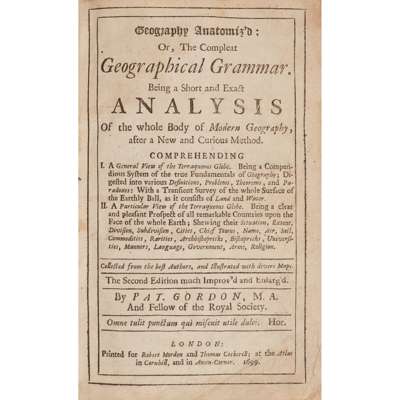 Or, The Compleat Geographical Grammar... London: Robert Morden, 1699. Second edition, 8vo in fours, 15 (of 16) maps, lacking the world map, several maps hand-coloured in outline, contemporary panelled calf, a few tears with occasional loss to text, some dampstaining, rear cover lacking some leather
