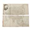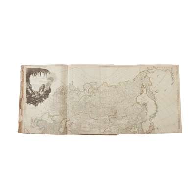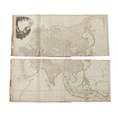 Being a complete collection of the most approved maps extant... London: Robert Sayer, [n.d.]. Folio, 35 double-page and folding maps, some hand-colouring in outline, contemporary half calf, joints split, spine flaking, a few tears (mostly closed), several maps repaired and strengthened to reverse, fraying and close trimming to the folding northern hemispherical map with slight loss to upper right corner, marginal repairs to Europe, some fraying and slight loss to edges of larger maps, final map (South America) and endpapers dampstained