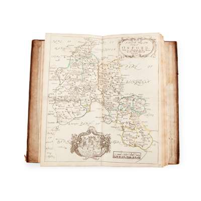 "A Generale Mapp of the Isles of Great Brittaine...", Buckinghamshire, Bedfordshire, Berkshire, Cumberland, Cornwall, Chester [Cheshire], Cambridgshire, Durham, Dorsetshire [Dorset], Devonshire [Devon], Derbyshire, Essex, Gloucestershire, Huntingdonshire, Hereford [Herefordshire], Hertfordshire, Hampshire, Kent, Lincolnshire, Leicestershire, Lancaster [Lancashire], Monmouthshire, Middlesex (coloured outlining), Nottinghamshire (some manuscript corrections/erasures to place names), Northumberland, Northamptonshire, Norfolk, Oxfordshire, Rutland, Sussex, Surrey, Suffolk, Staffordshire, Somerset, Shropshire, Worcestershire, Wiltshire, Westmorland, Warwickshire, South Wales, North Wales, Richmondshire, Yorkshire, Yorkshire - West Riding, Yorkshire - East Riding, Yorkshire - North Riding, "A Mapp of the Isles of Wight, Jarsey, Garnsey, Sarke, Man, Orcades, and Shetland", and a map of England and Wales hand-coloured in outline by Philip Lea, 18th century calf, small folio (34 x 20cm), Stevenson and another ownership inscription, some light dampstaining