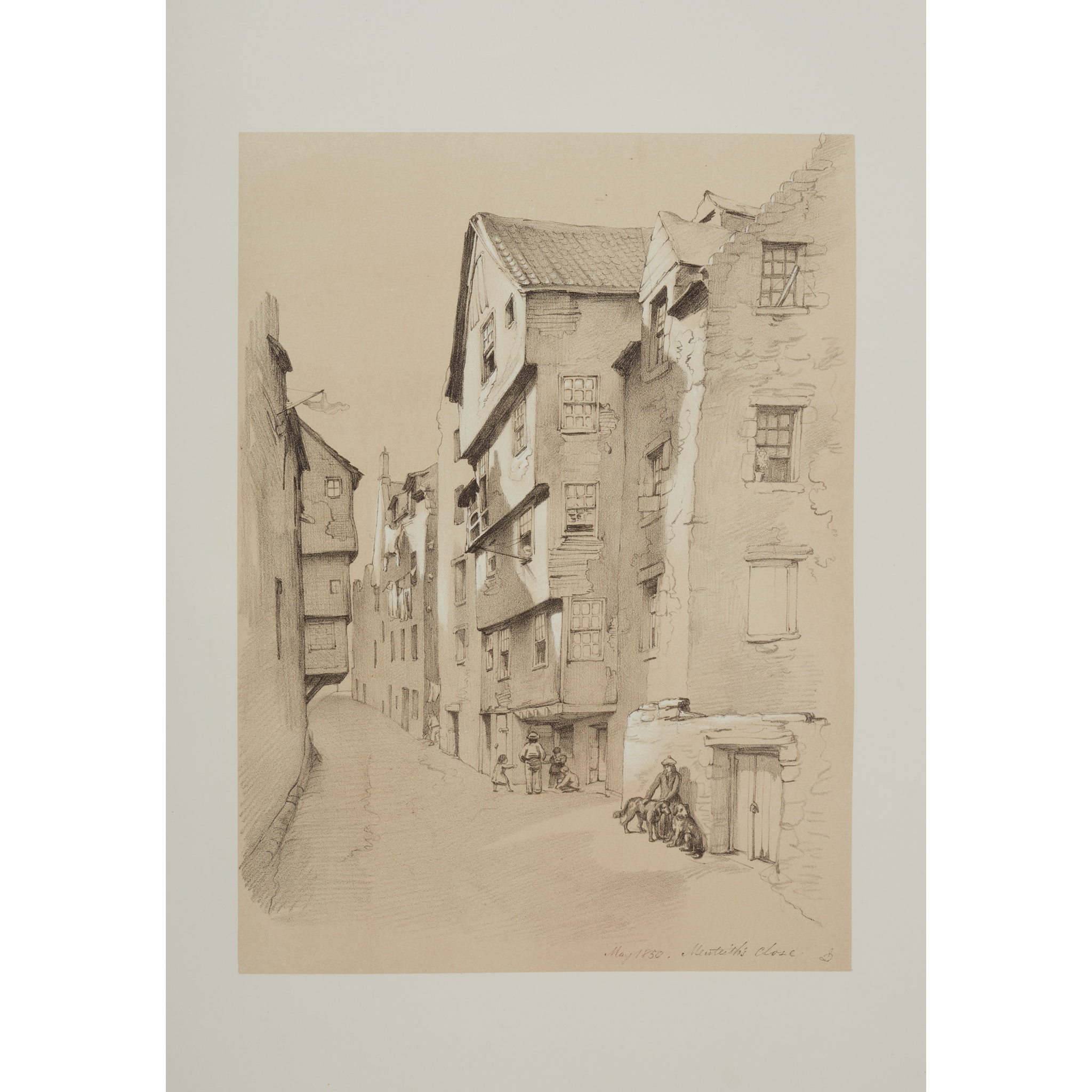 Edinburgh in the Olden Time. Edinburgh: George Stevenson, 1880. Large folio (58 x 33cm), 63 plates, original red quarter morocco over red cloth gilt, text block detached, some spotting, soiling and dampstaining (2)