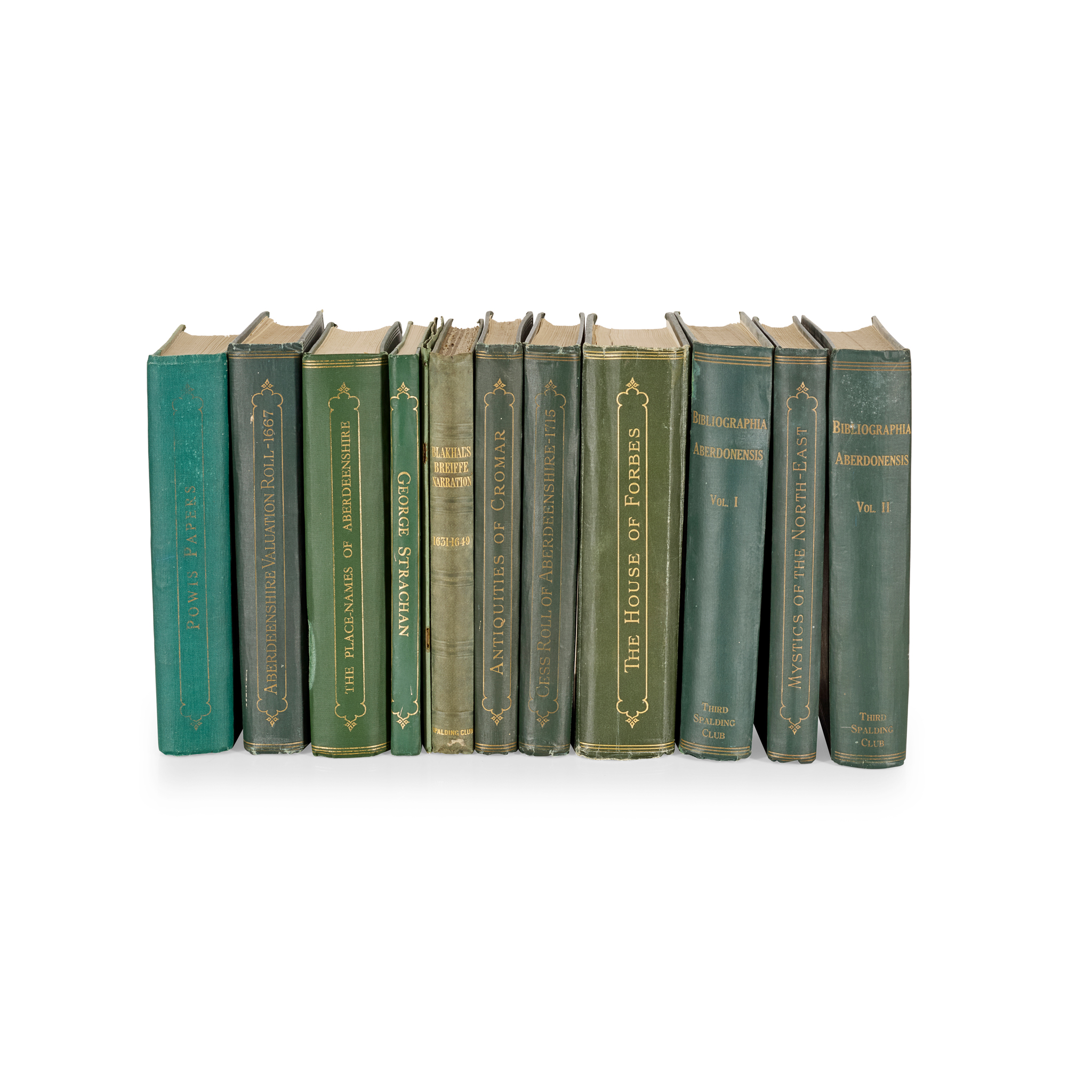 Abredoniae Utriusque Descriptio. A Description of Both Touns of Aberdeen by James Gordon, Parson of Rothemay, 1842 (damp-staining); A Breiffe Narration of the Services done to Three Noble Ladyes, by Gilbert Blakhal, 1844; The Heraldic Ceiling of the Cathedral Church of St Machar, Old Aberdeen, 1888 (one of 525 copies); Hectoris Boetii Murthlacensium et Aberdonensium Episcoporum Vitae, 1894 (one of 500 copies, frontispiece near-detached); The Records of Aboyne, 1894 (one of 525 copies); Records of Old Aberdeen MCLVII-MDCCCXCI, 1899 (one of 525 copies); The Family of Burnett of Leys, 1901 (one of 525 copies); The Blackhalls of that Ilk and Barra, 1905 (2 copies, each one of 500, one copy with title-page detaching); Bibliographia Aberdonensis, 1929 (2 volumes); Mystics of the North-East, 1931; The Prehistoric Antiquities of the Howe of Cromar, 1931; The Jacobite Cess Roll for the County of Aberdeen in 1715, 1932; The Valuation of the County of Aberdeen for the Year 1667, 1933; Drawings of Aberdeenshire Castles, 1936; The House of Forbes, 1937; Powis Papers, 1951; The Place-Names of Aberdeenshire, 1952; George Strachan. Memorials of a Wandering Scottish Scholar of the Seventeenth Century, 1956; Together with 2 copies of William Temple, The Thanage of Fermatyn, Aberdeen, 1894, 4to, original green cloth, similar condition to the preceding (22)