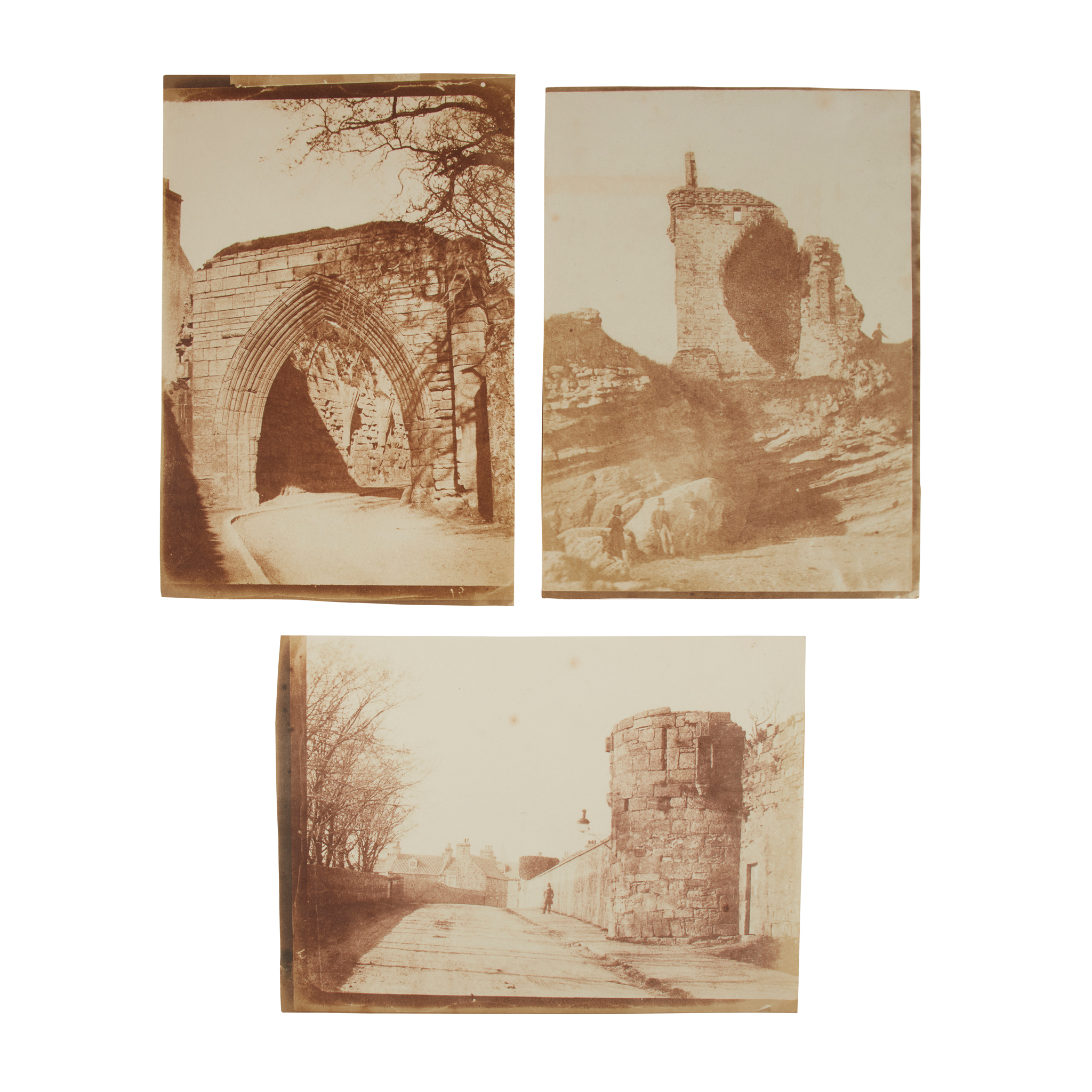 3 unmounted salt print photographs from calotype negatives of St Andrews showing the Abbey wall (21.5 x 15.5cm), the Fore Tower of the castle (21 x 15.5cm) and the Pends (22 x 14.5cm), (ref. David Octavius Hill & Robert Adamson SNPG p203 & 204). The Abbey wall has minor foxing and some edge fading, Fore Tower has some fading over the whole print, some edge fading to the Pends (3)