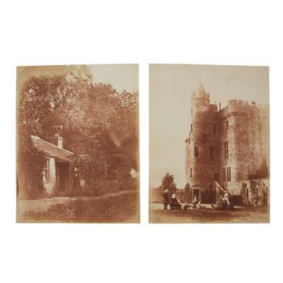 2 unmounted salt print photographs from calotype negatives. One of Bonaly Towers, 10.5 x 15.5cm, with a group of 10 including D.O. Hill, John Henning, Mrs. Cockburn, Lord Cockburn and Mrs. Cleghorn, the other of the Lodge at Bonaly with John Henning dressed as Edie Ochiltree, 20.5 x 16.5cm, some edge fading (ref. David Octavius Hill & Robert Adamson SNPG p160 & 210) (2)