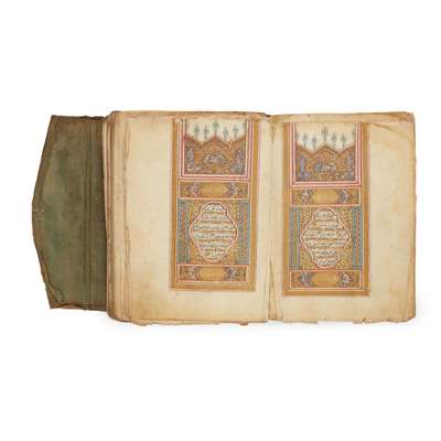 Arabic manuscript in black ink on polished laid paper, 300 ff., leaf dimensions 17.1 x 11.2cm, naskh script, 15 lines to the page, elaborate illuminated opening bifolium, each page of remaining text within red and gold frame, sura-headings in white thuluth on gold ground, gold roundel aya-markings and rubricated recitation markings throughout, contemporary dark red leather binding with envelope-flap and gilt filigree panels, variable soiling, several leaves including opening bifolium loose with concomitant rumpling and nicks to margins, with a laid-in contemporary calligraphic panel in Arabic reading ‘khayrukum man ta’allama al-Qur'an wa ‘alimahu’ ('the best of you is he who has learned and known the Qur'an', a well-known hadith of the Prophet Muhammad)