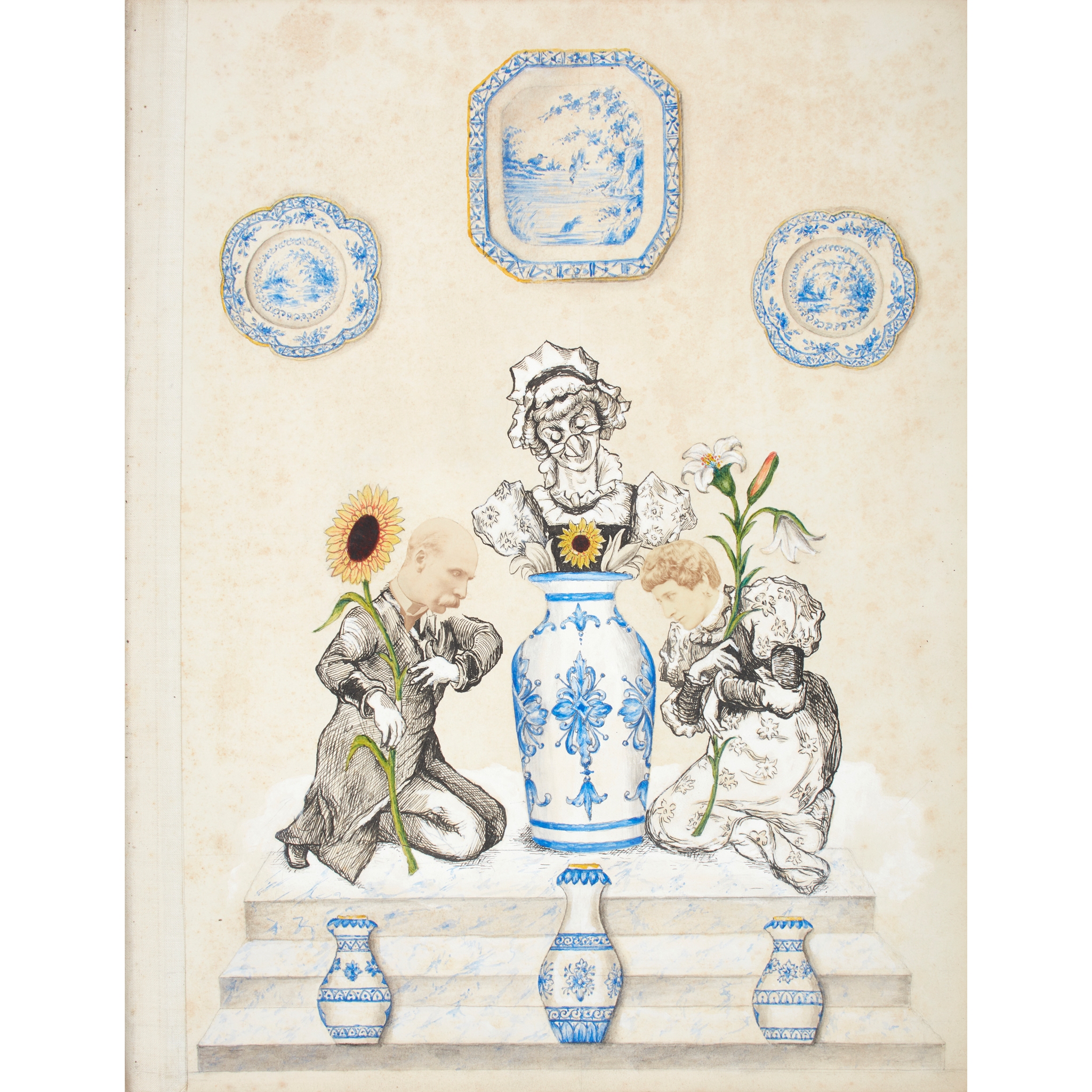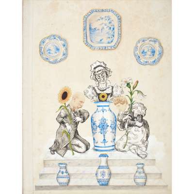 Folio dark blue half morocco album with compiler's name (Con Pilcher) gilt to front board, 37 thick card leaves (34.8 x 26.4cm) containing designs in watercolour, pen-and-ink, pencil, and oil (rectos only), incorporating in total 88 pasted-in albumen-print portrait photographs, many trimmed to outline of head, subjects captioned in ink and including Napoleon III, Empress Eugenie, Louis-Napoleon Prince Imperial, Georgina Countess of Dudley (Victorian society beauty), Patsy Cornwallis-West (mistress of Edward VII), soldiers (Sir Evelyn Wood; Lord Chelmsford, Sir Bartle Frere, Sir Garnet Wolseley), actors and actresses (Eveleen Rayne, Violet Cameron, Ellen Terry, Connie Gilchrist, Florence St John, Lily Langtry, Kyrle Bellew), and others including Con Pilcher (depicted in an ink and wash sketch playing the lute), most of the designs signed and dated and including whimsical jeux d'esprit in addition to botanical and natural history backgrounds, 9 further photographs mounted to rear endpapers